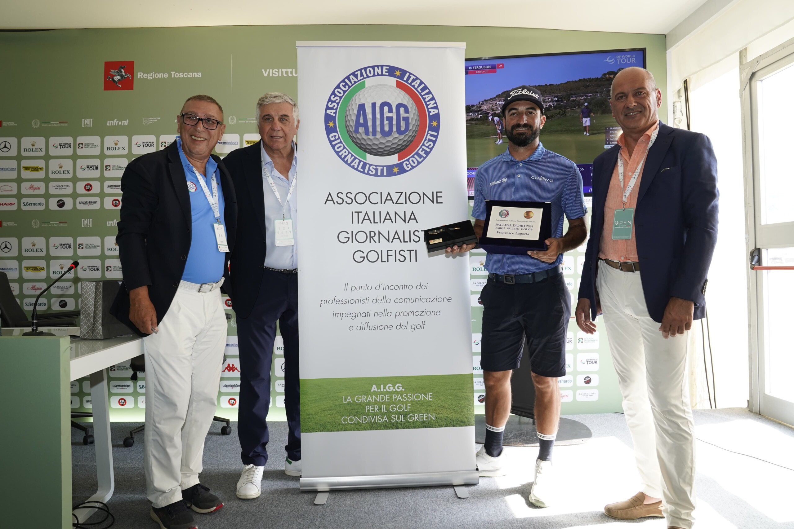 Francesco Laporta ha ricevuto la “Pallina d’oro”, riconoscimento che dal 2005 gli iscritti all’Associazione Italiana Giornalisti Golfisti, che festeggia quest’anno i 50 anni, attribuiscono ogni anno al personaggio che maggiormente si è distinto nel panorama del golf italiano per meriti agonistici, tecnici o manageriali. Il premio dal 2022 ha assunto anche il nome di “Targa Fulvio Golob” per ricordare il giornalista che ha guidato per alcuni anni l’AIGG. Alla cerimonia, che si è tenuta del Media Center dell’82° Open d’Italia, con Stefano Cazzetta, Presidente dell’Associazione, sono intervenuti Cristiano Cerchiai, Presidente della Federazione Italiana Golf, Stefano Frigeri, Vice Presidente Vicario FIG, Roberto Zappa, Direttore Tecnico squadre nazionali FIG, vincitore del premio nel 2024, oltre a Laporta.